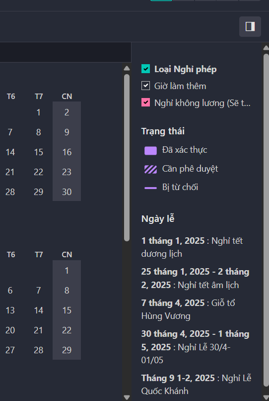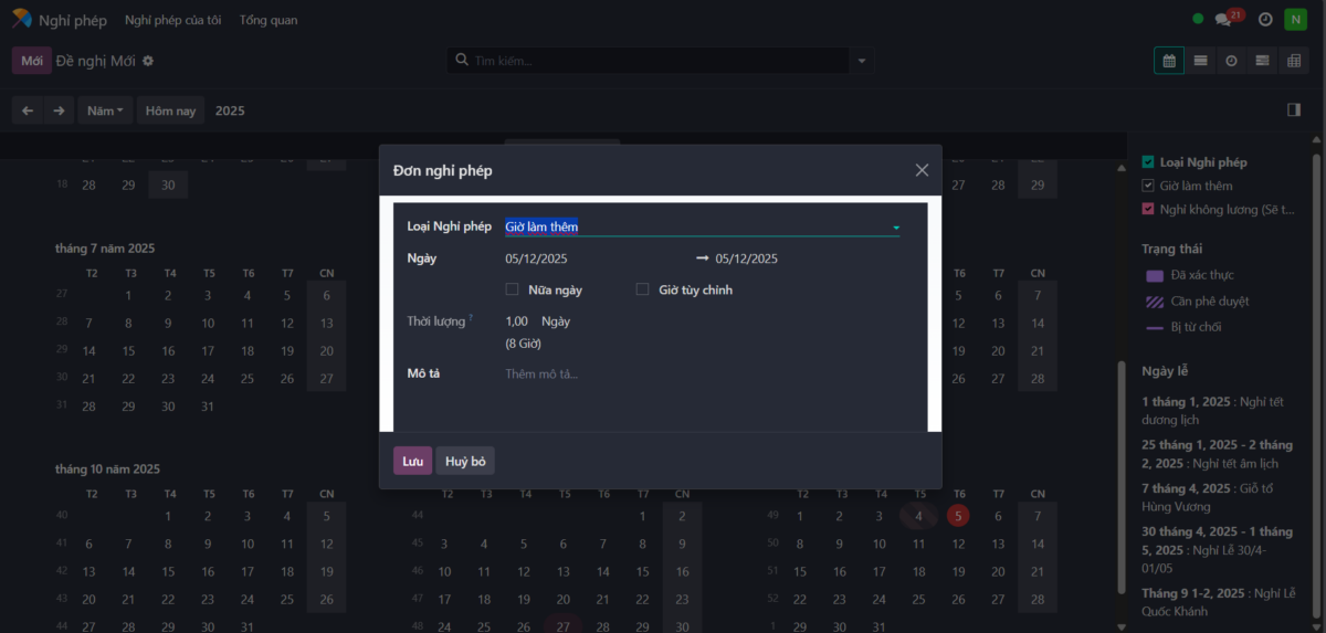 Gửi yêu cầu, Phê duyệt, Theo dõi phép, Lịch nghĩ, Báo cáo